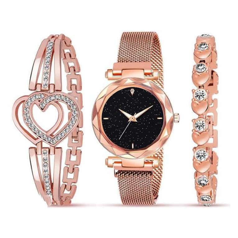 The package includes one Women’s Metal Watch and two matching metal bracelets, making it a versatile and attractive accessory set for any occasion.
